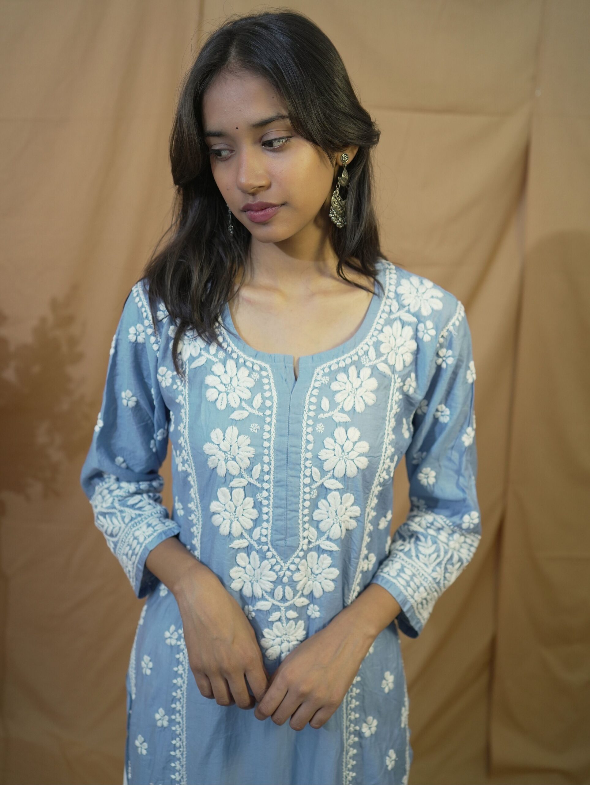 Nayantara Muslin Chikankari Kurti- Ice Blue 1